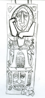 This is the sketch and process of creating the anniversary shield for the back of the tiki piece. I wanted to incorporate on the back some of the colors used on the front of the piece. It was actually fun to create and cut out all that lettering. I used fusible web ("Misty Fuse") to iron the letters on. I thought that would be easier (less time consuming!) than trying to sew around each letter. It was the first time I used the iron on technique, and it works really well. I will definitely consider using it on other projects. I did sew all the green border work on, and in the final image the shield is sewn to the fabric.